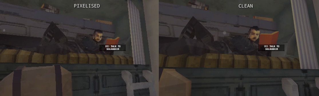 I've been thinking seriously of getting rid of the pixelisation effect. I'm worried it just makes the game look... bad. Too little detail, makes everything look a little muddy. On the other hand, it looks really good partnered with the vertex snapping shader on certain objects (like the NPCs).